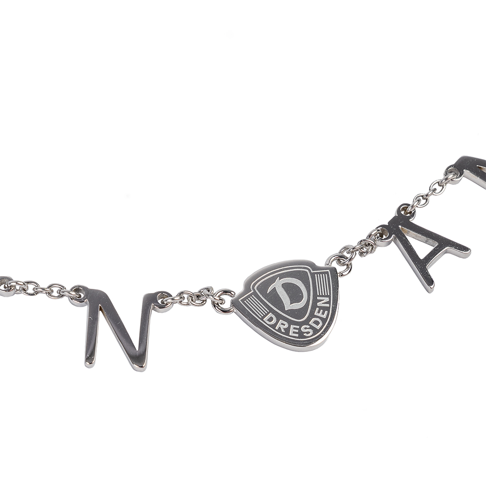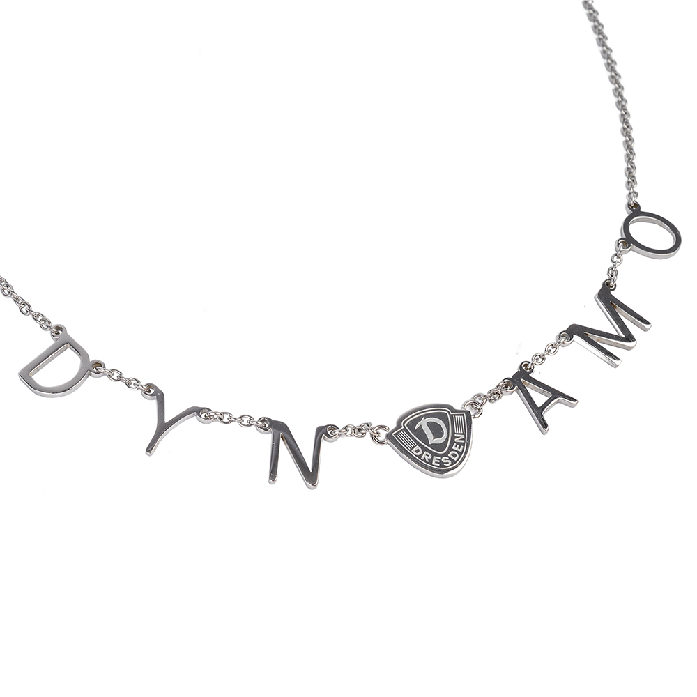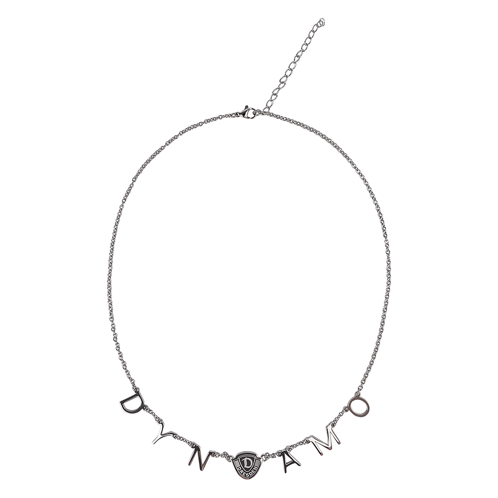 Klassische Halskette aus Edelstahl mit einem D Y N - A M O Schriftzug aus einzelnen Buchstaben und dem Wappen unserer SGD in der Mitte.