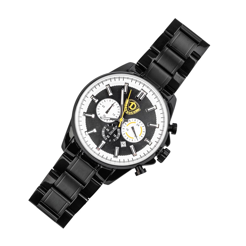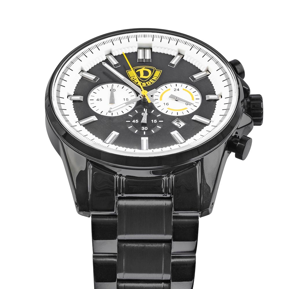 Tickt für Dynamo – schwarz-gelb am Handgelenk! Dieser robuste Chronograph verbindet Funktionalität mit der Leidenschaft für die SGD. Mit dem farbigen Wappen auf dem Ziffernblatt zeigt ihr überall, dass ihr für Verein und Heimatstadt lebt. Ob im Wohnzimmer, auf dem Spieltag oder unterwegs in Dresden – diese Uhr ist ein Zeichen für Zusammenhalt und Dynamik.