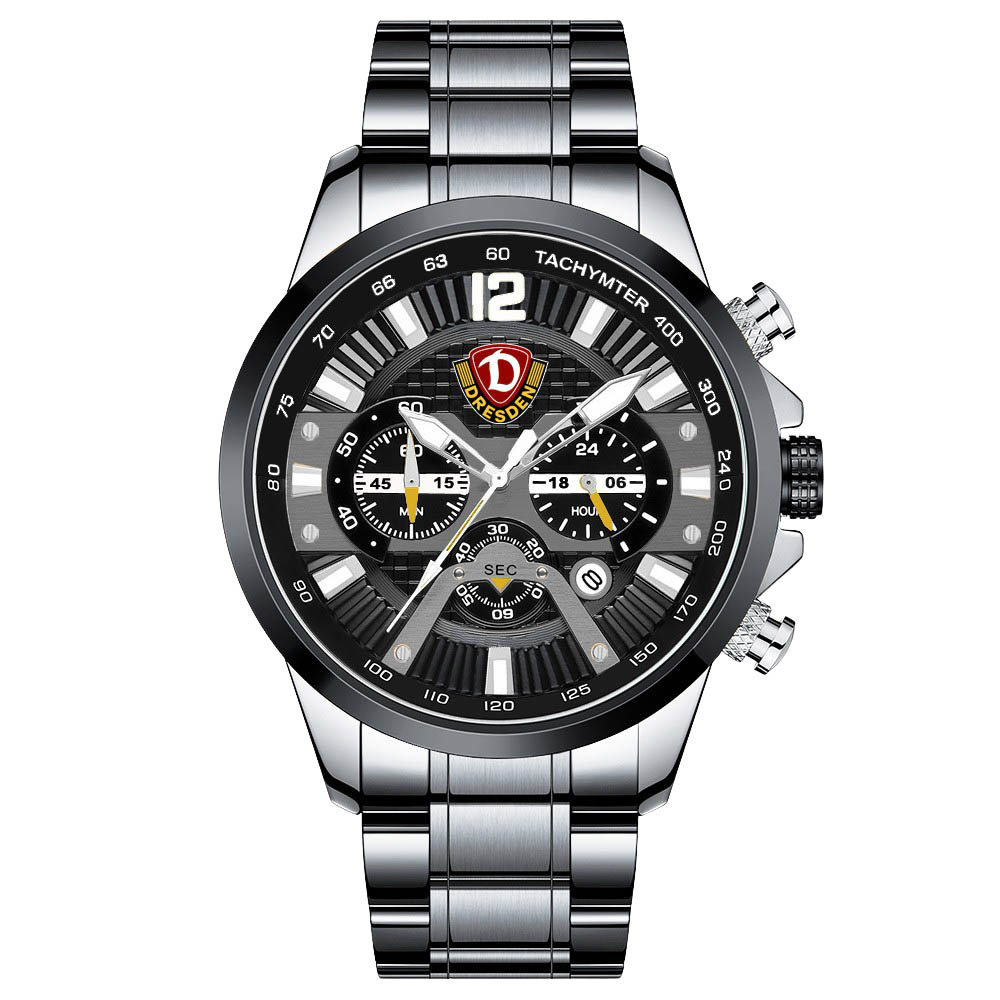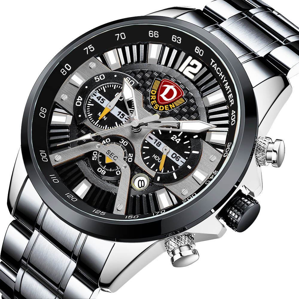 Sportlich-eleganter Herrenchronograph mit Stoppfunktion, 24 Stundenanzeige und zusätzlicher Tachymeteranzeige in Bigsize. Der Eyecatcher für jeden Dynamo Fan.