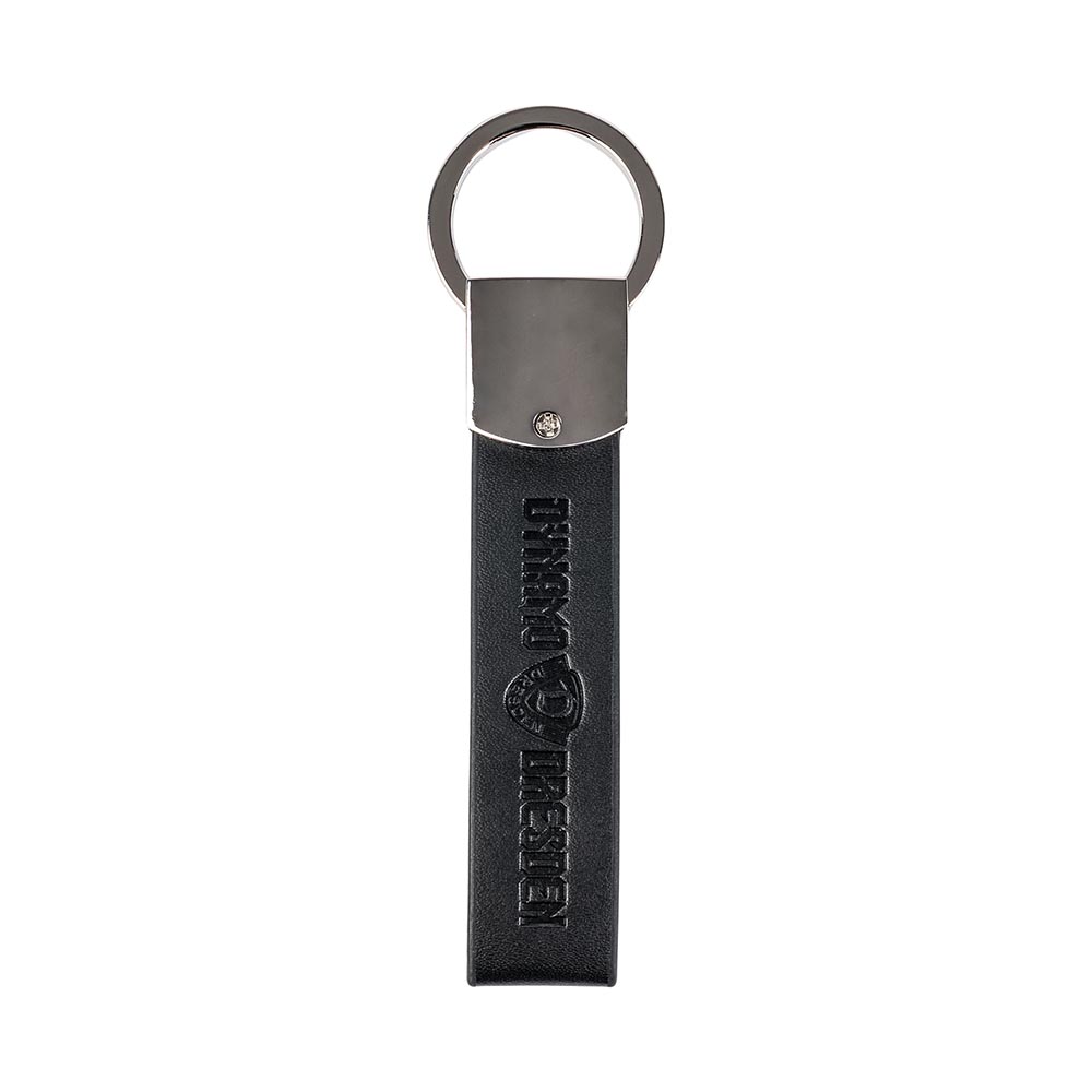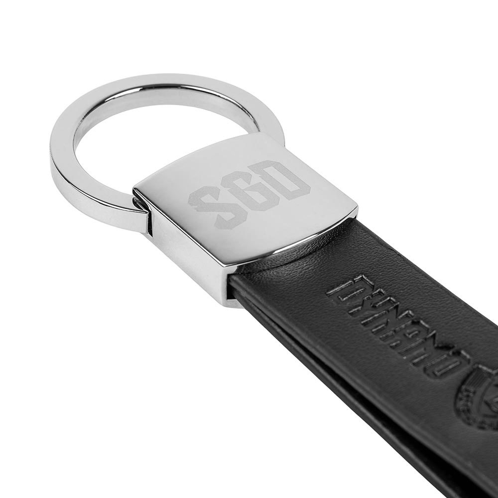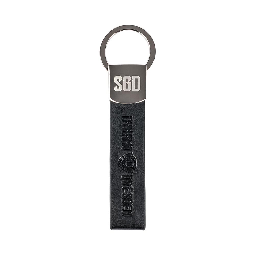 Edler Schlüsselanhänger in dynamischem Design mit geprägtem Motiv auf dem Band und SGD Schriftzug.
