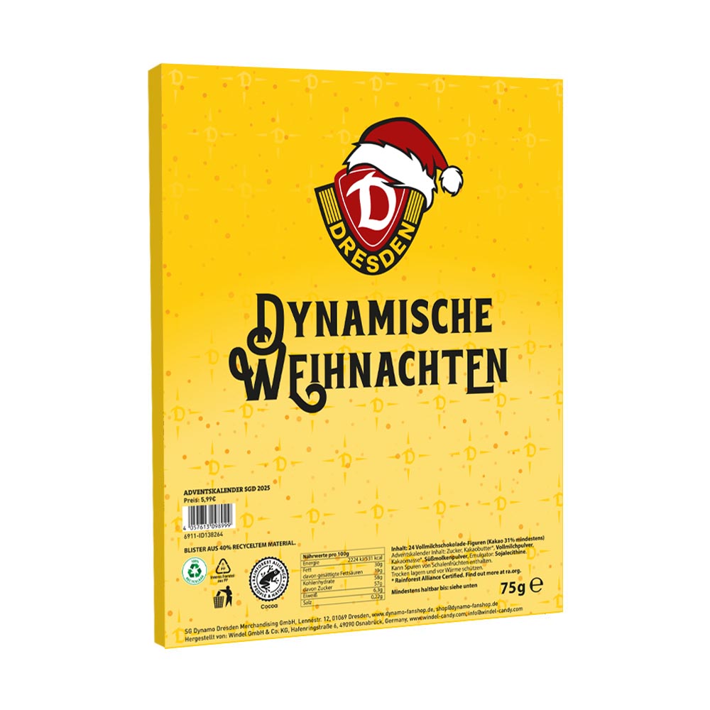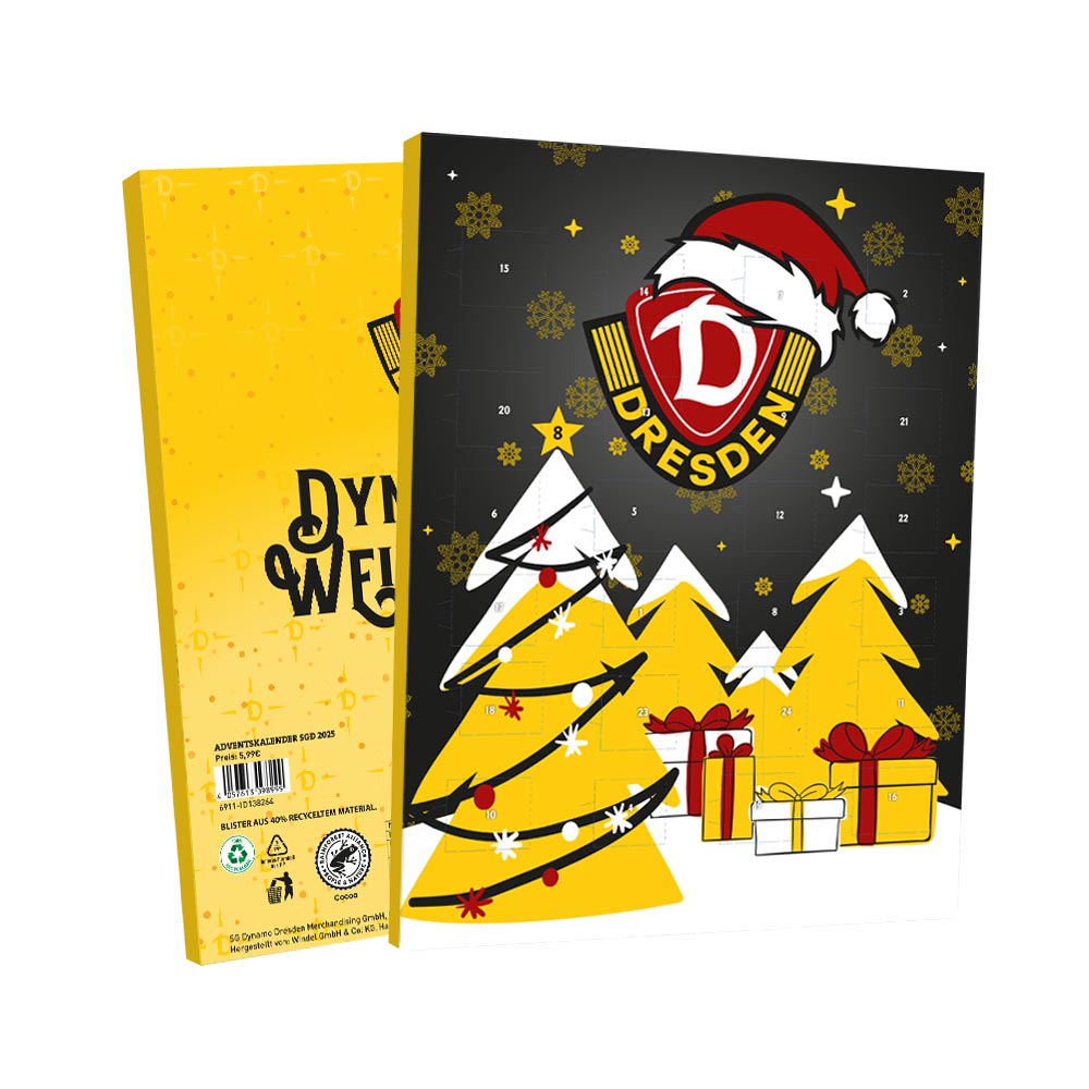 Mit dem Adventskalender SGD 2025 kommt Dynamo direkt in dein Wohnzimmer! 24 schokoladige Überraschungen – jeden Tag ein Stück Tradition und Leidenschaft der Sportgemeinschaft Dresden. So verkürzt ihr die Wartezeit bis Weihnachten auf schwarz-gelbe Art.