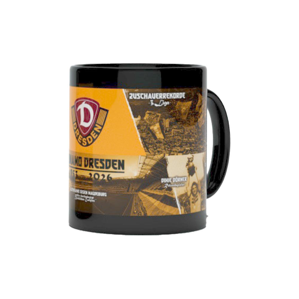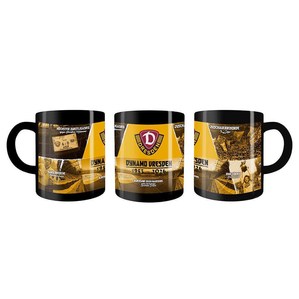 73 Jahre Dynamo. 73 Jahre Leidenschaft, Zusammenhalt und Sportgemeinschaft. Mit der Kaffeetasse „73 Jahre Tradition“ holst du dir ein Stück SGD direkt auf den Tisch. Schwarz wie der Morgenkaffee. Gelb wie unser Herz für Dynamo. Das Jubiläumsdesign erinnert daran, wofür wir stehen: Seit 1953 für Verein und Heimatstadt.