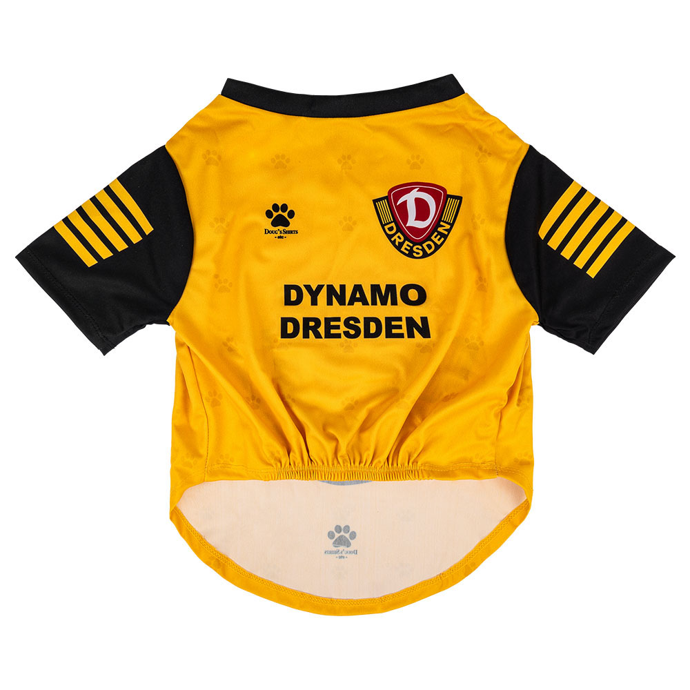Mit dem schwarz-gelben Hundetrikot samt Wappen zeigt auch dein Vierbeiner, wo er hingehört: zur Sportgemeinschaft! Ob im Park, auf der Straße oder beim Heimspiel vorm Fernseher – Dynamo ist überall.