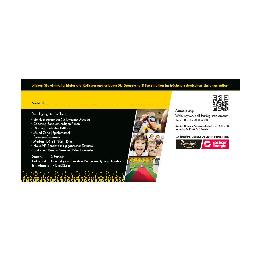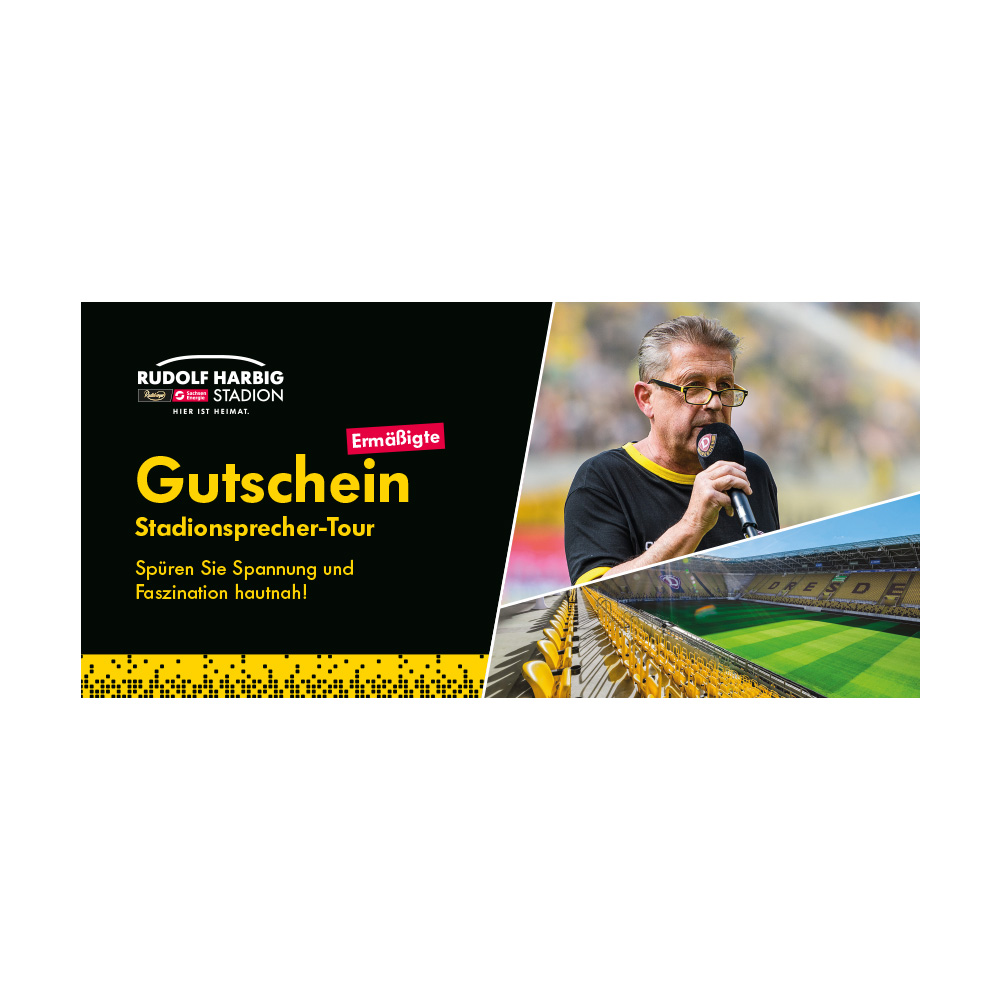 Mit diesem Gutschein geht es mitten rein in unser Wohnzimmer. Bei der Stadionsprecher-Tour führt euch Peter Hauskeller persönlich durch das Rudolf-Harbig-Stadion – dorthin, wo an jedem Spieltag schwarz-gelbe Geschichten geschrieben werden. Ein Blick hinter die Kulissen unserer Heimstätte, dahin, wo Dynamo lebt: Kabinen, Tribünen und Wege, die sonst nur Spieler, Mannschaft und Verein kennen. Für alle, die die SGD nicht nur sehen, sondern spüren wollen.