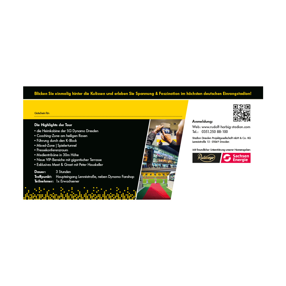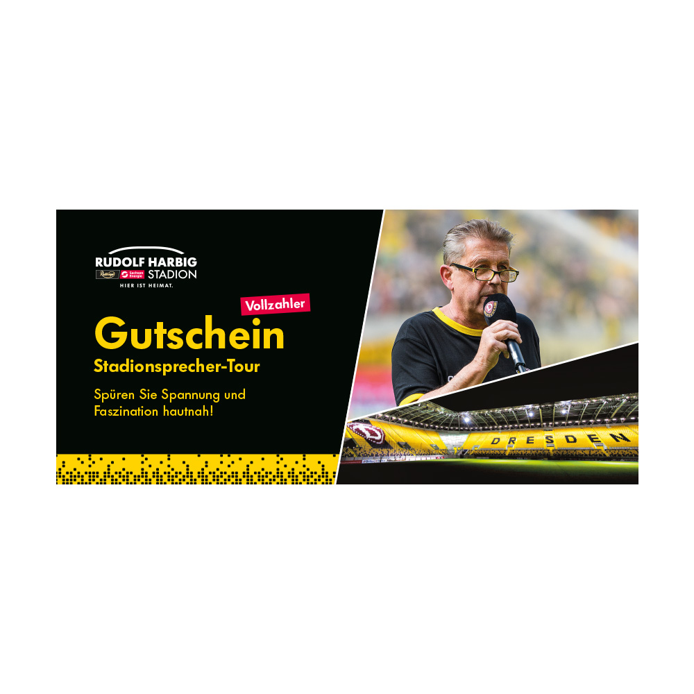 Mit diesem Gutschein geht es mitten rein in unser Wohnzimmer. Bei der Stadionsprecher-Tour führt euch Peter Hauskeller persönlich durch das Rudolf-Harbig-Stadion – dorthin, wo an jedem Spieltag schwarz-gelbe Geschichten geschrieben werden. Ein Blick hinter die Kulissen unserer Heimstätte, dahin, wo Dynamo lebt: Kabinen, Tribünen und Wege, die sonst nur Spieler, Mannschaft und Verein kennen. Für alle, die die SGD nicht nur sehen, sondern spüren wollen.