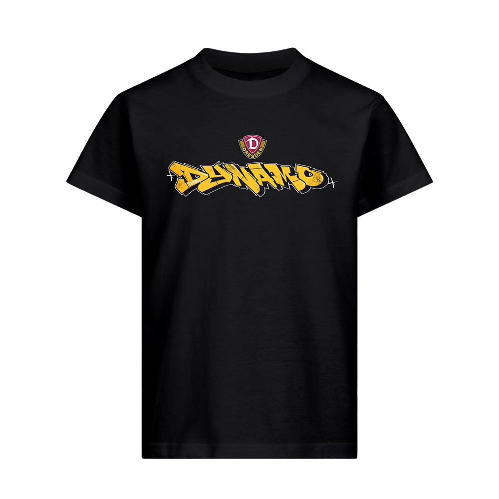 Schwarz und Gelb, voller Leidenschaft: Mit dem Kinder T-Shirt "GRAFFITI" zeigst du schon den Kleinsten ihre Verbundenheit zu Dynamo Dresden. Stilischer "Dynamo" Schriftzug mit dem Wappen unserer SGD auf der Brust – für echte SGD Fans von klein auf.