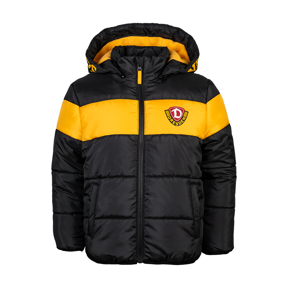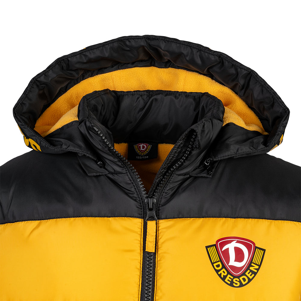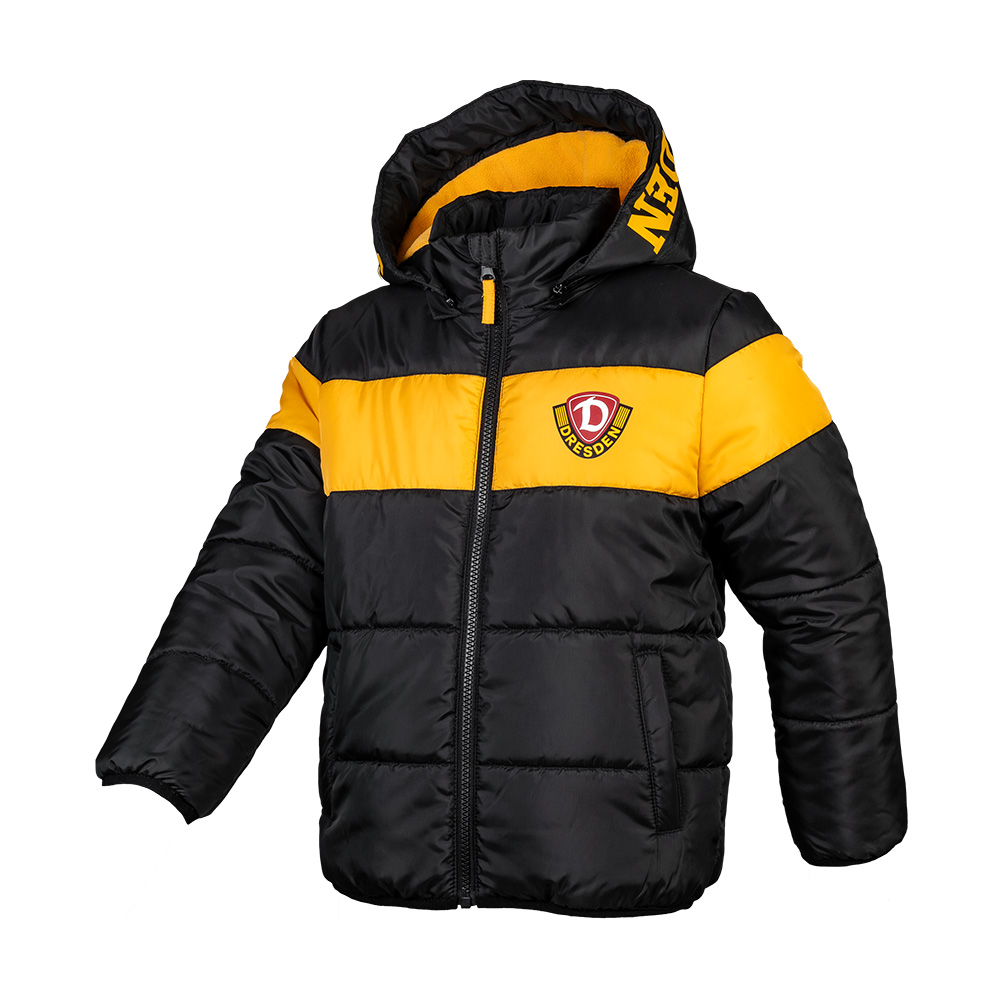 Mit der Kinder Winterjacke bleibt der Nachwuchs auch in der kalten Jahreszeit Dynamo-treu. Schwarz-Gelb durch und durch – mit großem "SG DYNAMO DRESDEN" Schriftzug auf der Kapuze und dem Wappen unserer Sportgemeinschaft auf der Brust. Die wattierte Jacke schützt vor Wind und Kälte, ist bequem und robust – perfekt für Schule, Stadion oder Alltag. So zeigt auch der Dynamo-Nachwuchs: Wir sind Dresden. Wir sind Dynamo.