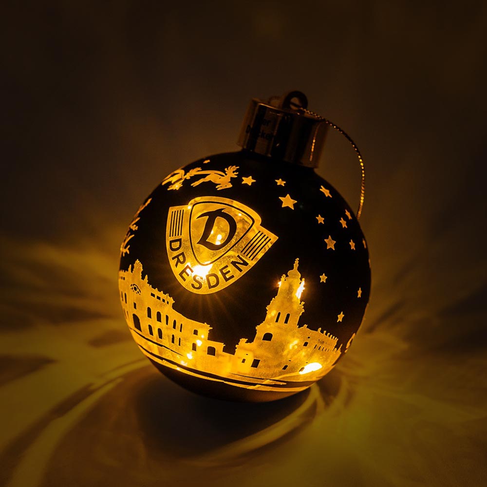 Einzigartige und extra große Weihnachtsfreude: SG Dynamo Dresden Christbaumkugel mit Leuchtfunktion im exklusiven Design.