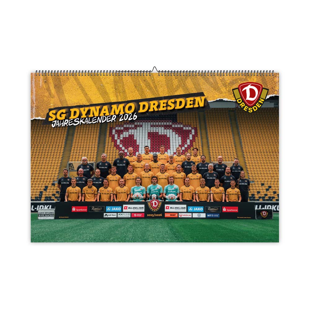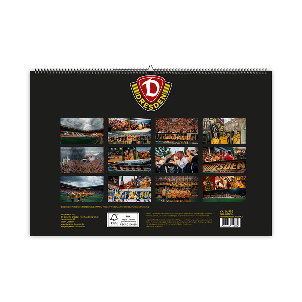 Mit dem Jahreskalender 2026 hältst du die Leidenschaft für Dynamo Dresden jeden Tag in deinen Händen. Schwarze und gelbe Momente, starke Bilder und Collagen bringen den Spirit der SGD direkt in dein Zuhause oder dein Büro. Für Verein und Heimatstadt, für echte Fans – jeden Tag ein Stück Dynamo.