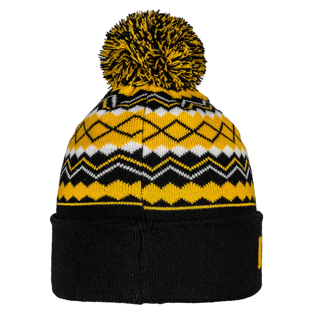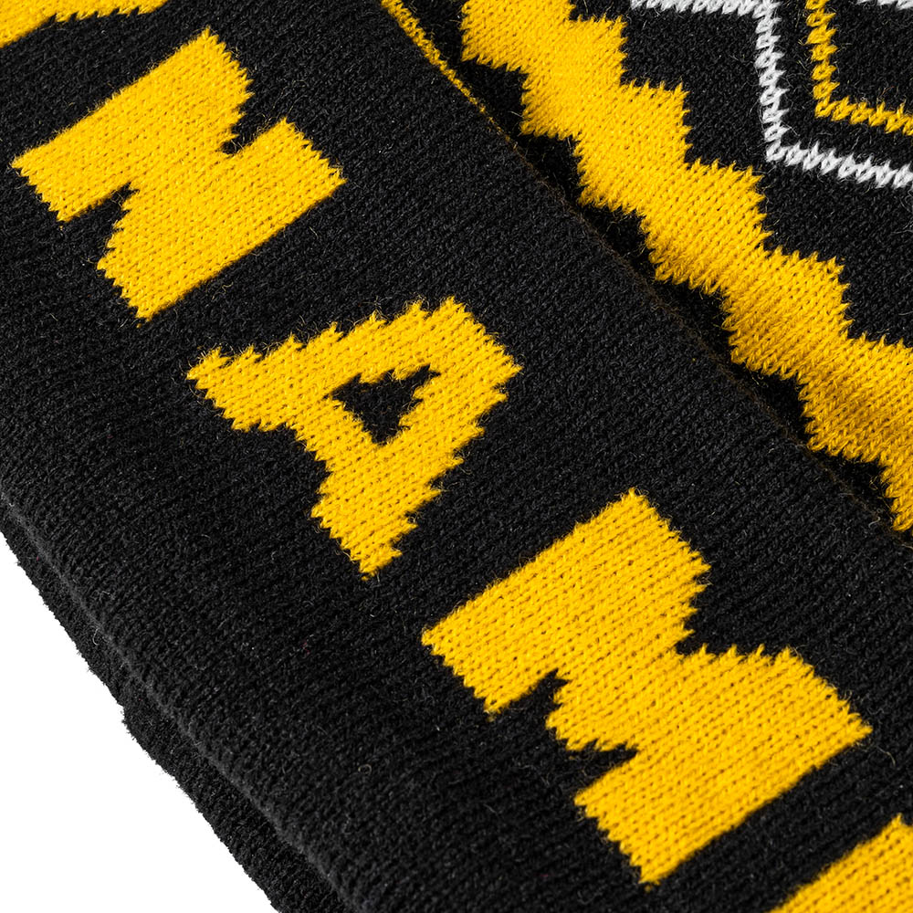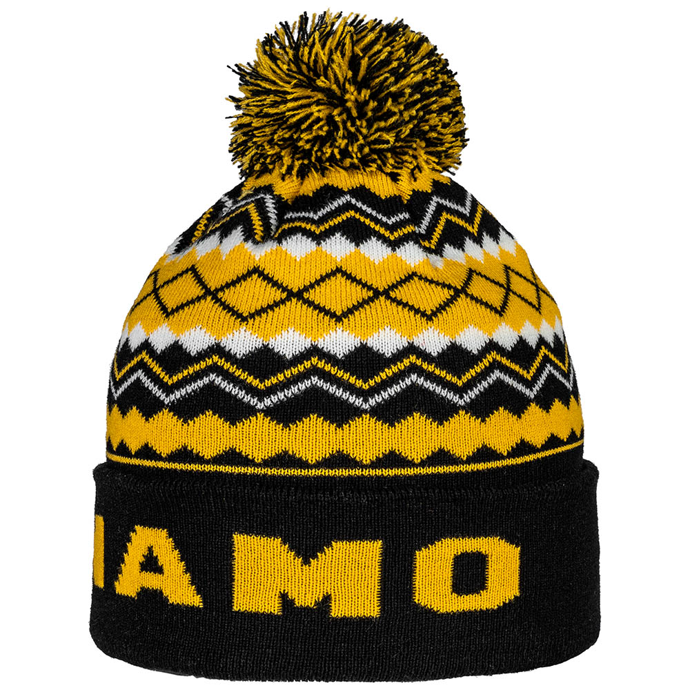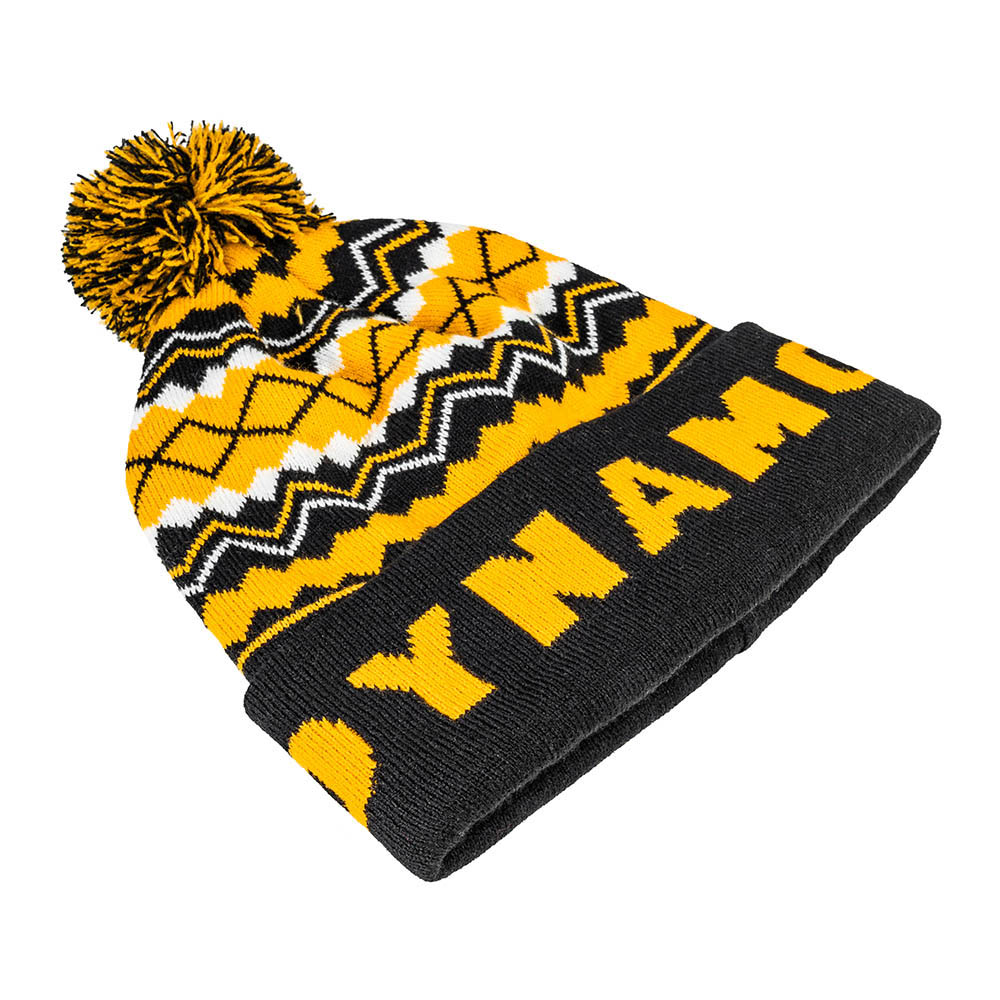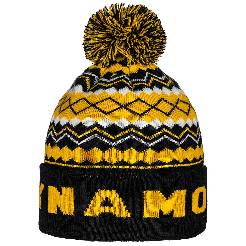 Klassisches Bommel-Beanie in auffälligem Muster mit einem DYNAMO Schriftzug und dem Wappen der SGD auf der Vorderseite.