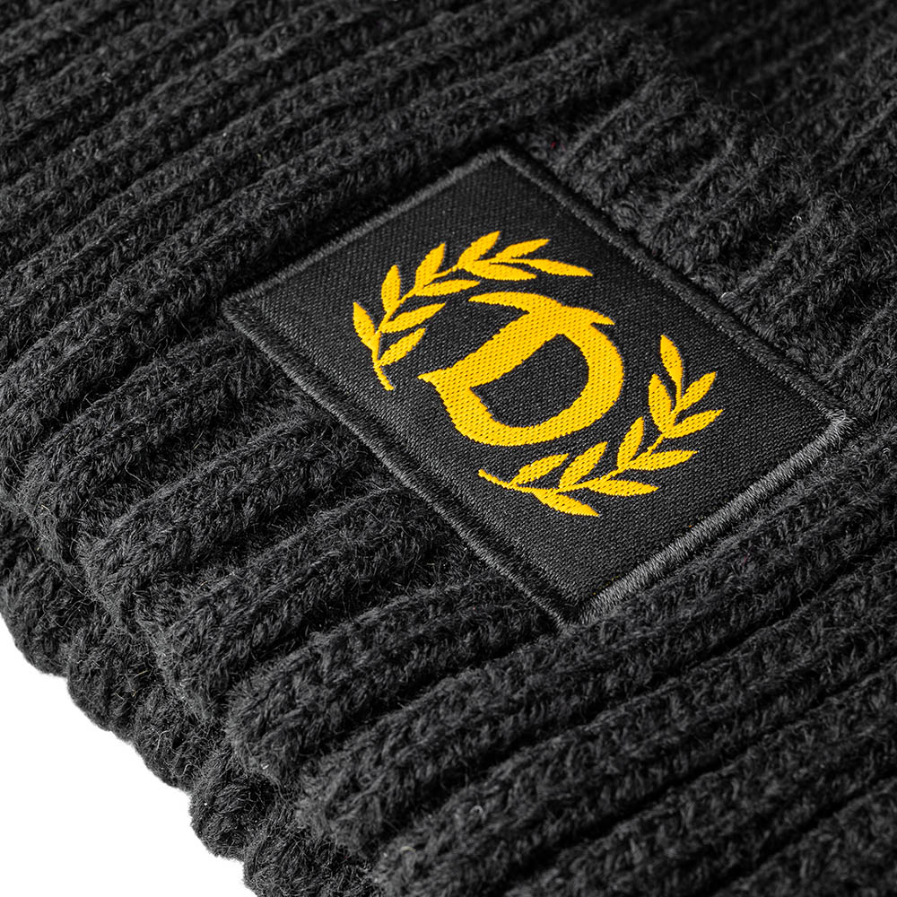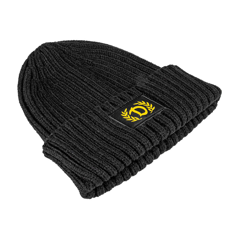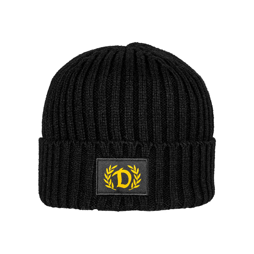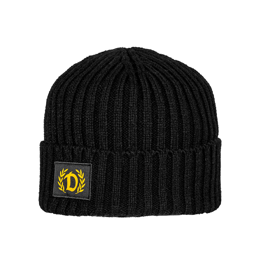 Klassisches Bronx-Beanie in modischer Strickung mit dezentem "DYNAMO - D" umschlossen von einem Ehrenkranz auf der Vorderseite.