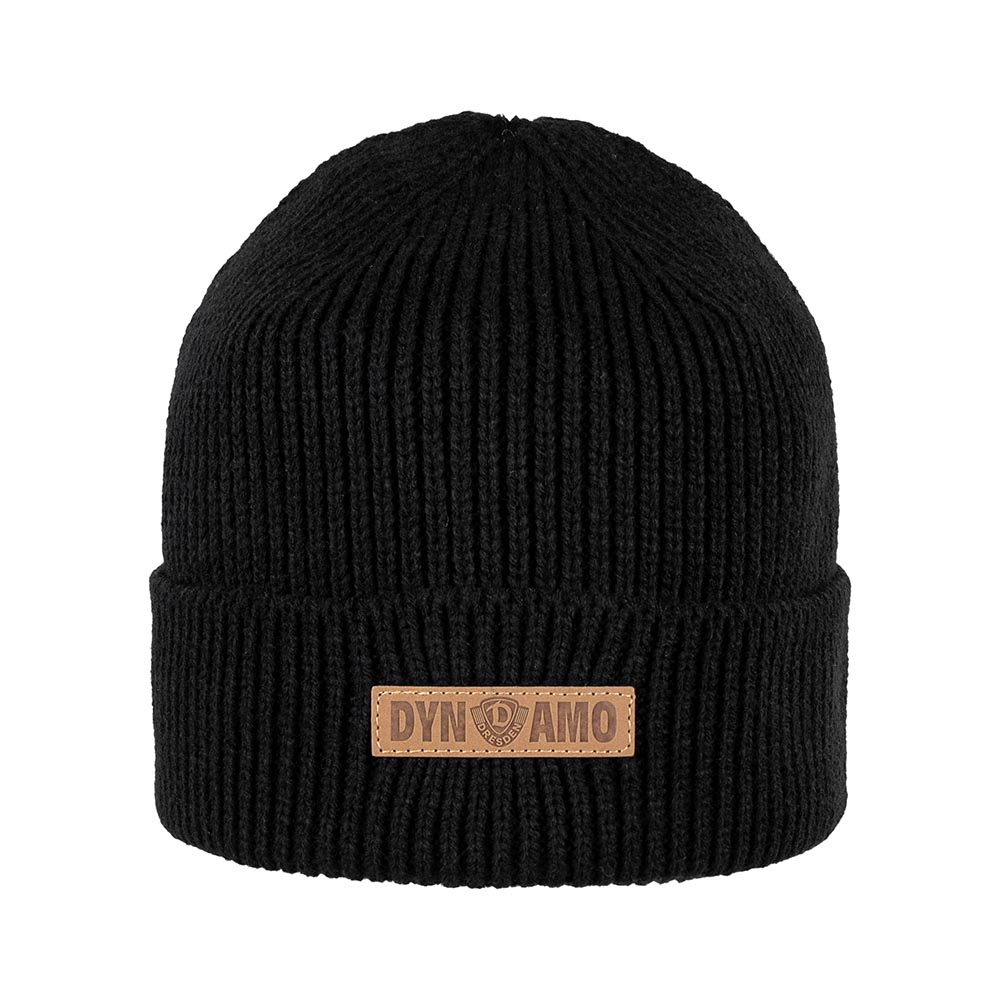 Klassisches Beanie in modischer Strickung mit Wappen und DYN AMO Schriftzug auf einem edlen Lederpatch an der Krempe.